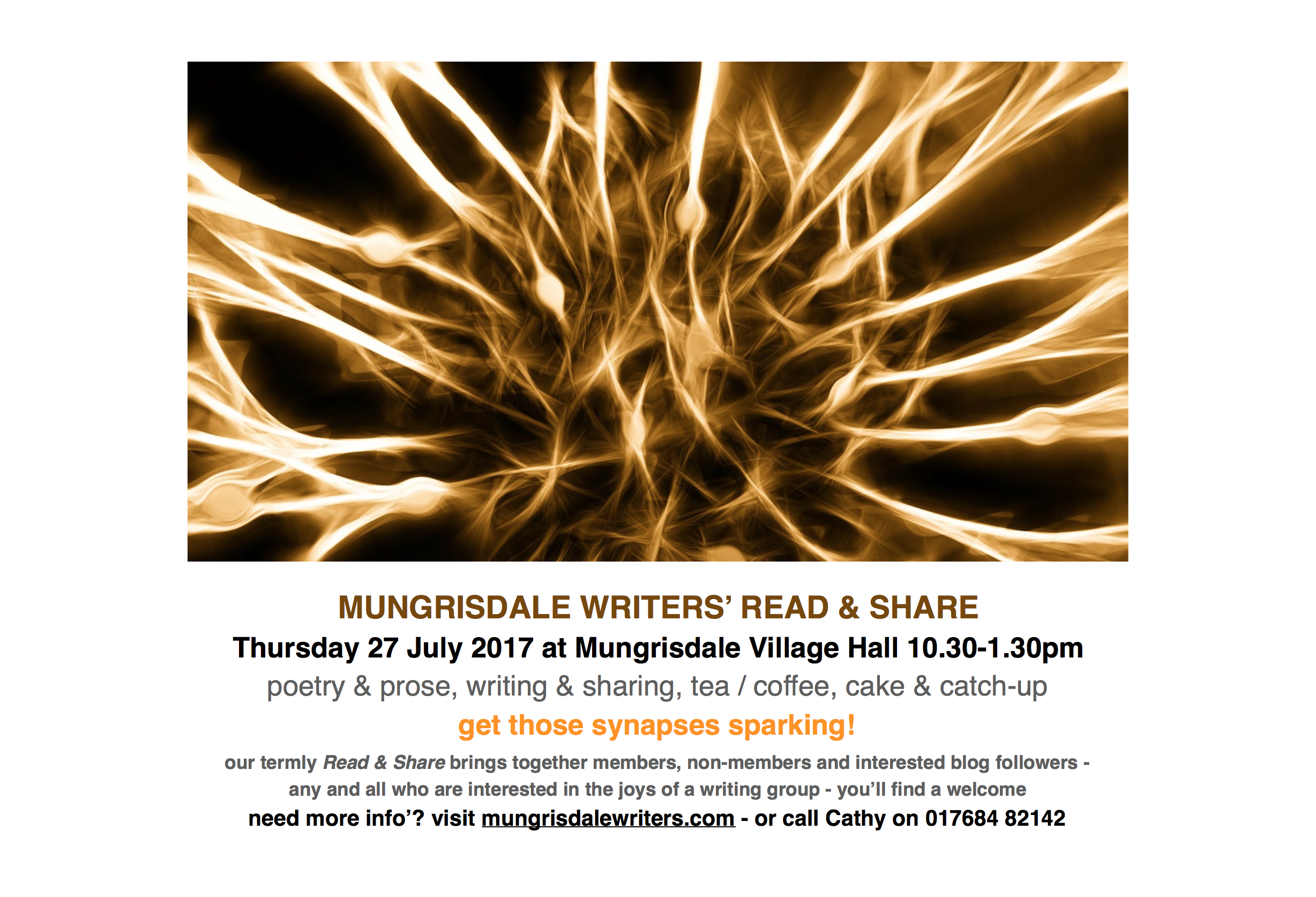 Once in each of the year’s three terms Mungrisdale Writers are invited to choose a single, short, favourite piece of writing (ie, not a chapter or two of one’s latest novel!) penned in the last term, for sharing in turn. The second element of these gatherings will involve our getting ‘in the mood’ – perhaps by listening to a beautiful piece of music, or taking a short walk outside, followed by the writing of a new short piece that may or may not be shared. There’ll then be an opportunity to invite feedback from fellow writers that will be offered along the usual broadly agreed lines for critique (see iii above). With plenty of time for coffee, cake and catch up, these sessions will allow opportunities for sharing and celebrating all that we’re learning in the main, tutored, sessions of each term. The forthcoming Read & Share will be from 10.30-1.30 on the 20th April 2017.